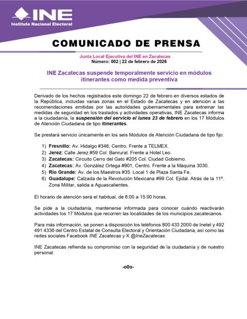 Derivado de los hechos registrados este domingo 22 de febrero en diversos estados de la República, incluidas varias zonas en el Estado de Zacatecas y en atención a las recomendaciones