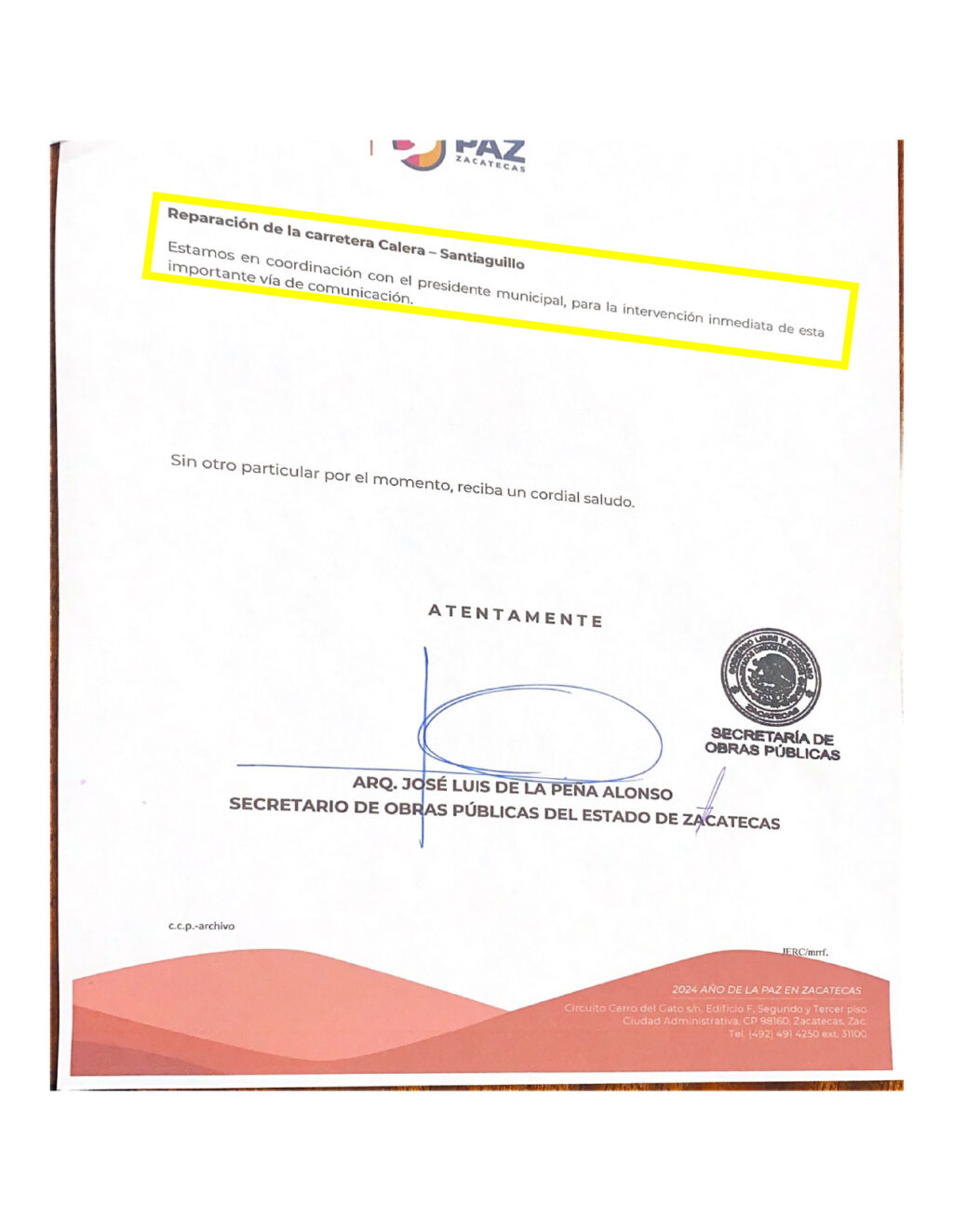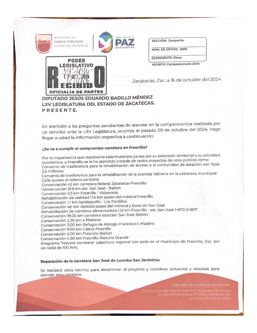 El proyecto de Calera–Santiaguillo forma parte de una serie de gestiones que Chuy Badillo ha impulsado ante las autoridades estatales, de manera directa en la Secretaría de Obras Públicas como desde la tribuna legislativa.