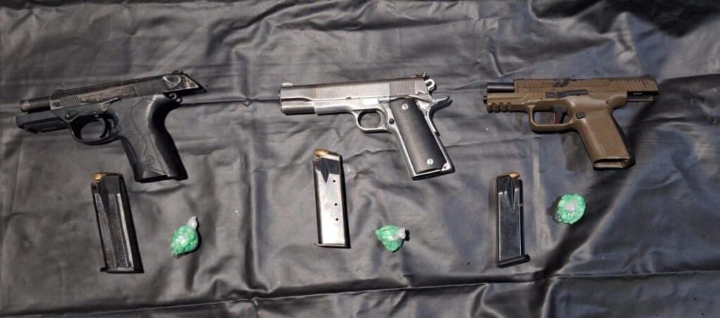 A estas personas les fueron aseguradas tres armas de fuego cortas, cargadores, cartuchos y 20 bolsitas de plástico que contenían una sustancia granulada con las características de la droga conocida como cristal.