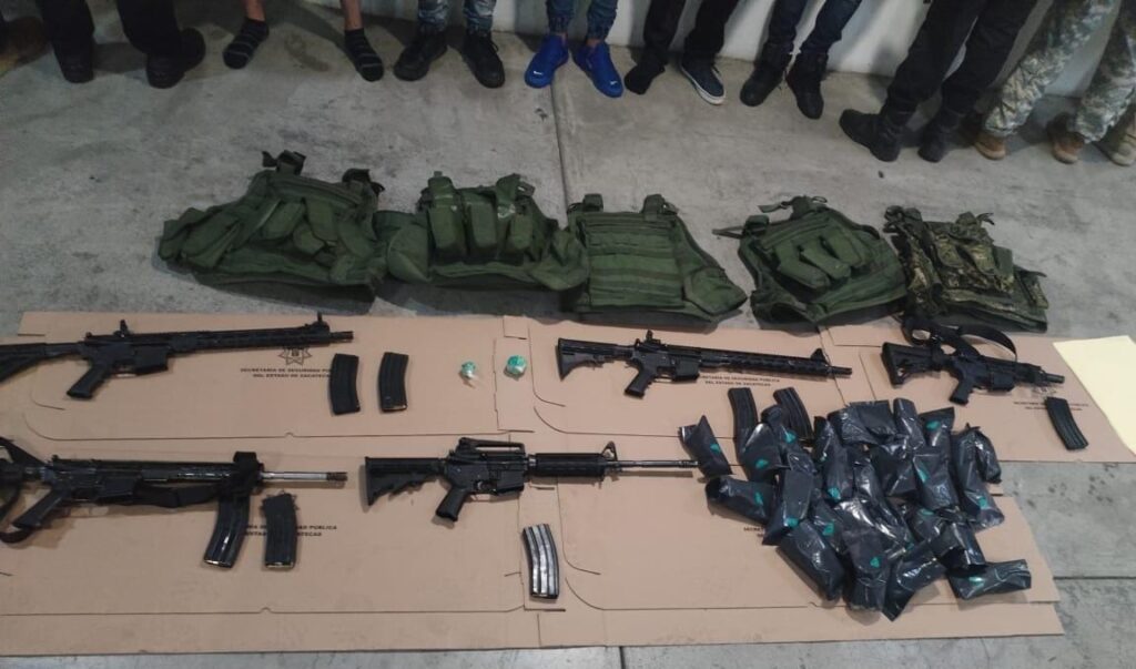 Derivado del despliegue de elementos de la Fuerza de Reacción Inmediata Zacatecas (FRIZ) Grupo de Operaciones Rurales (GORUZ) ambos de la Policía Estatal Preventiva, Policía de Investigación de la Fiscalía General de Justicia del Estado, en coordinación con personal del Ejército Mexicano y la Guardia Nacional, en una primera acción, en la colonia Las Aves, lograron ubicar a personas que portaban chalecos balísticos y armas largas.
